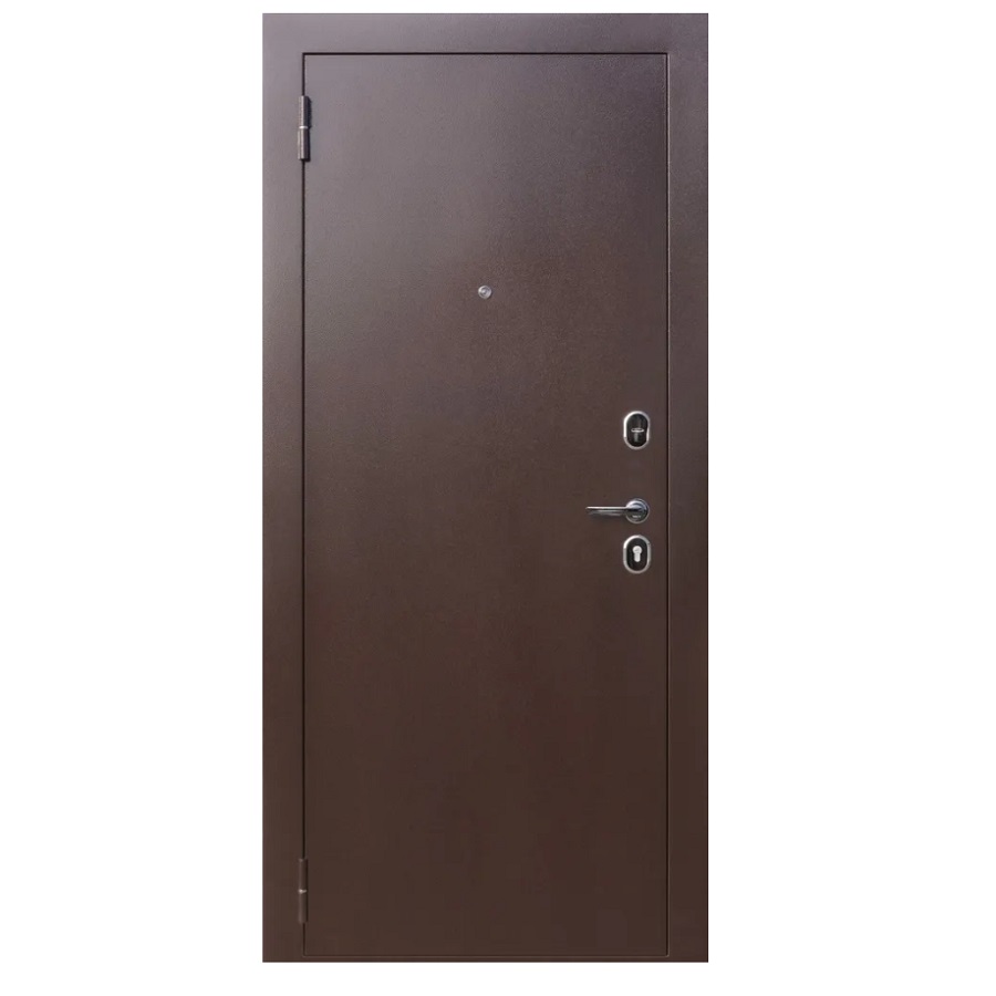 С внешней и внутренней стороны дверного полотна стальной лист с атмосферостойким порошковым покрытием цвета "Медный антик" наполнение пенополистиролом.