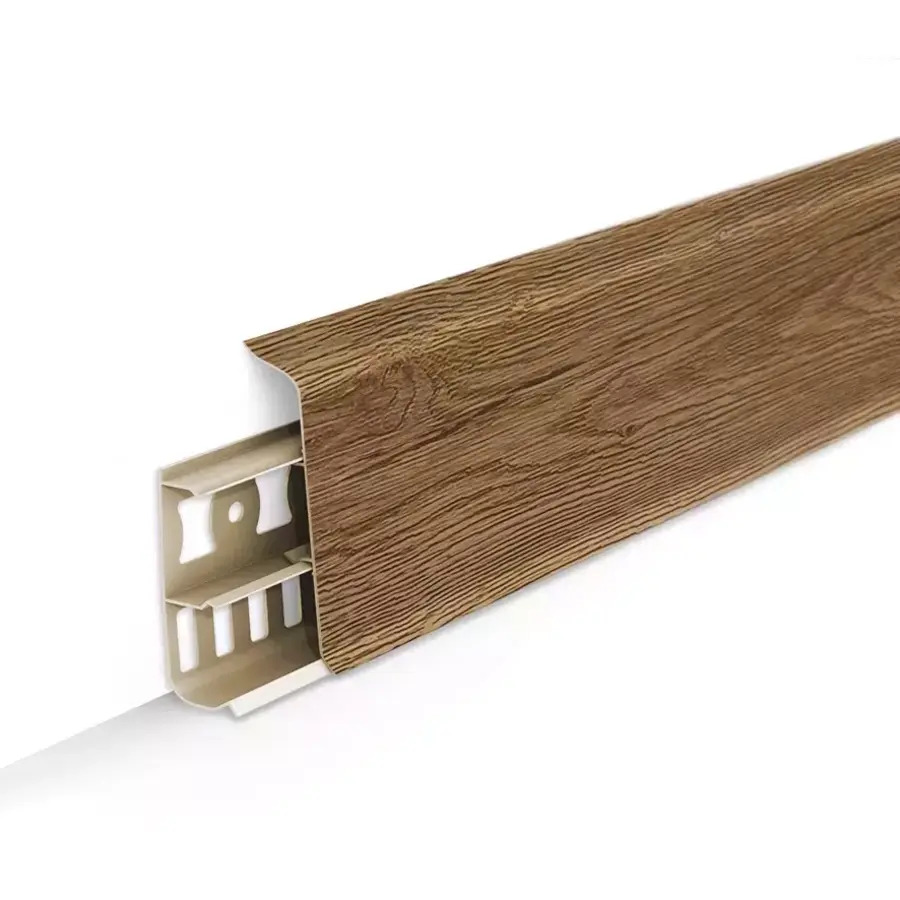 Современный пластиковый плинтус из ПВХ имеет высоту 70 мм и ширину 21 мм при длине 1100 мм. Каждый плинтус состоит из двух частей - заднего монтажного профиля с перфорацией для облегчения установки дюбель-гвоздями или саморезами и кабель-канала, и цельной лицевой части, которую можно снимать и устанавливать обратно в процессе установки и эксплуатации.