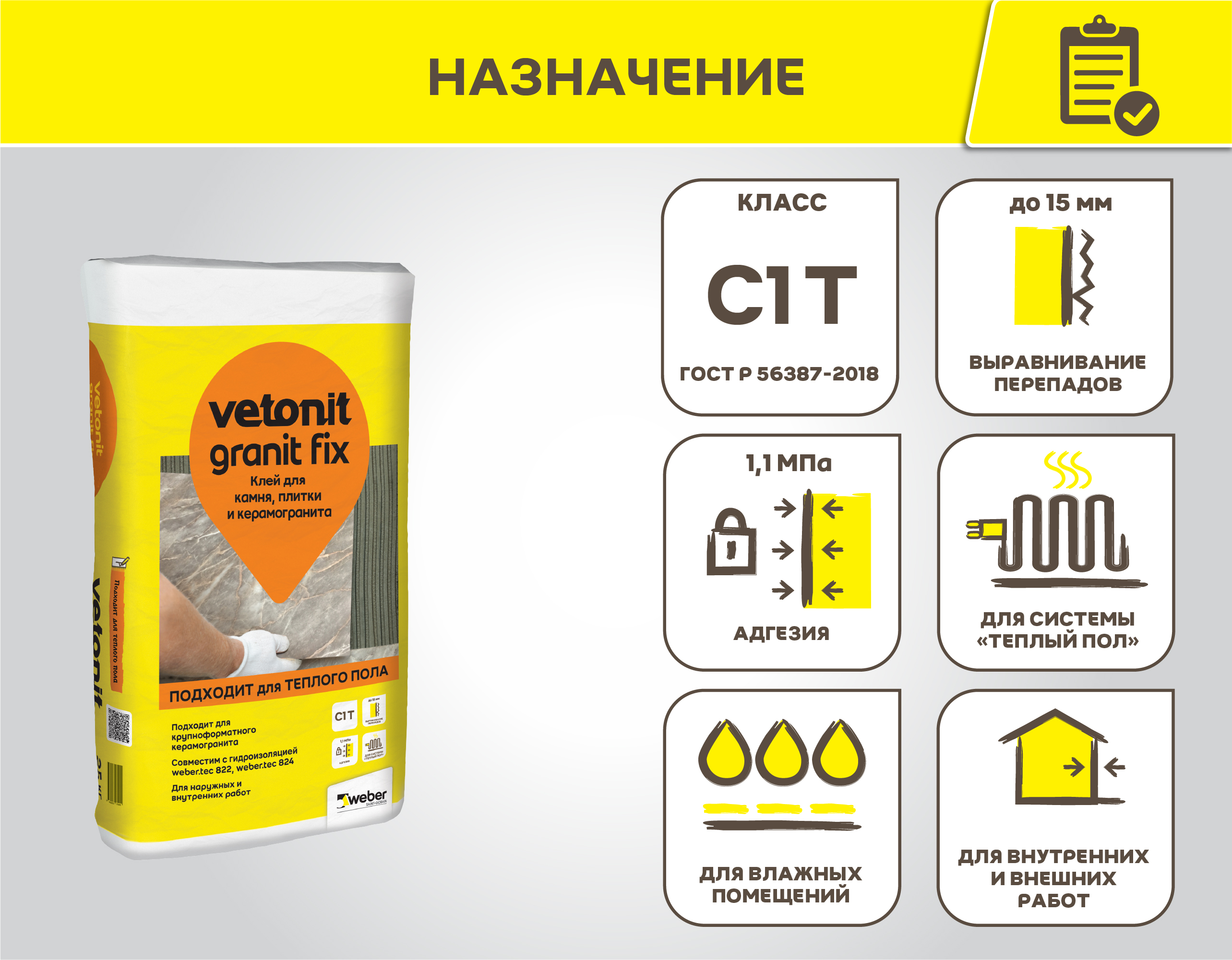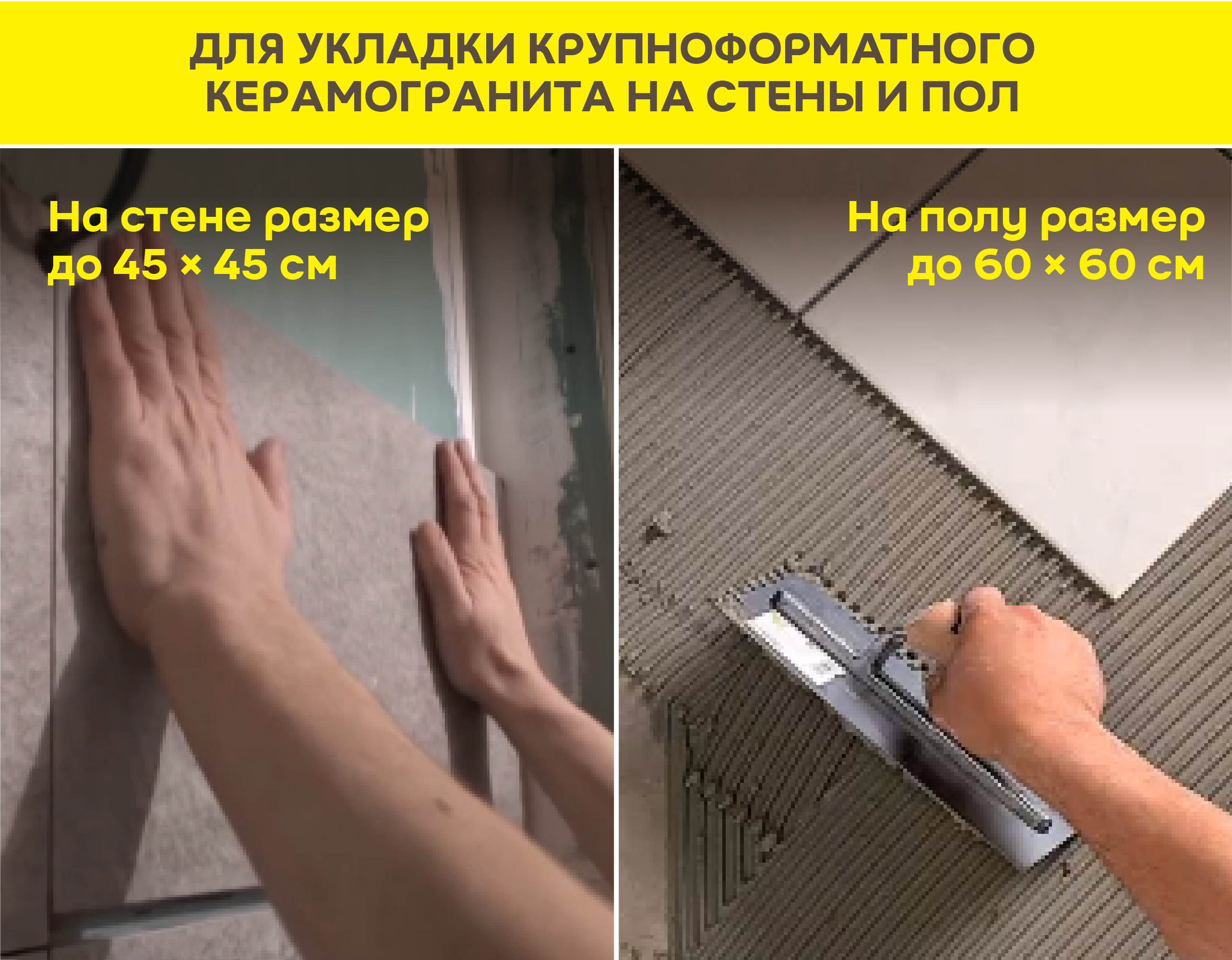 - Укладки керамогранита, керамической (в т.ч. двойного обжига) и клинкерной плитки и мозаики на вертикальные и горизонтальные поверхности внутри помещений с нормальной и повышенной влажностью, а также снаружи зданий
