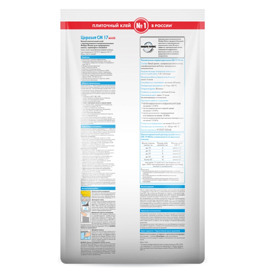 Белый эластичный клей Церезит CM 17 White с армирующими микроволокнами Фибра Флекс для природного камня, мрамора и мозаики