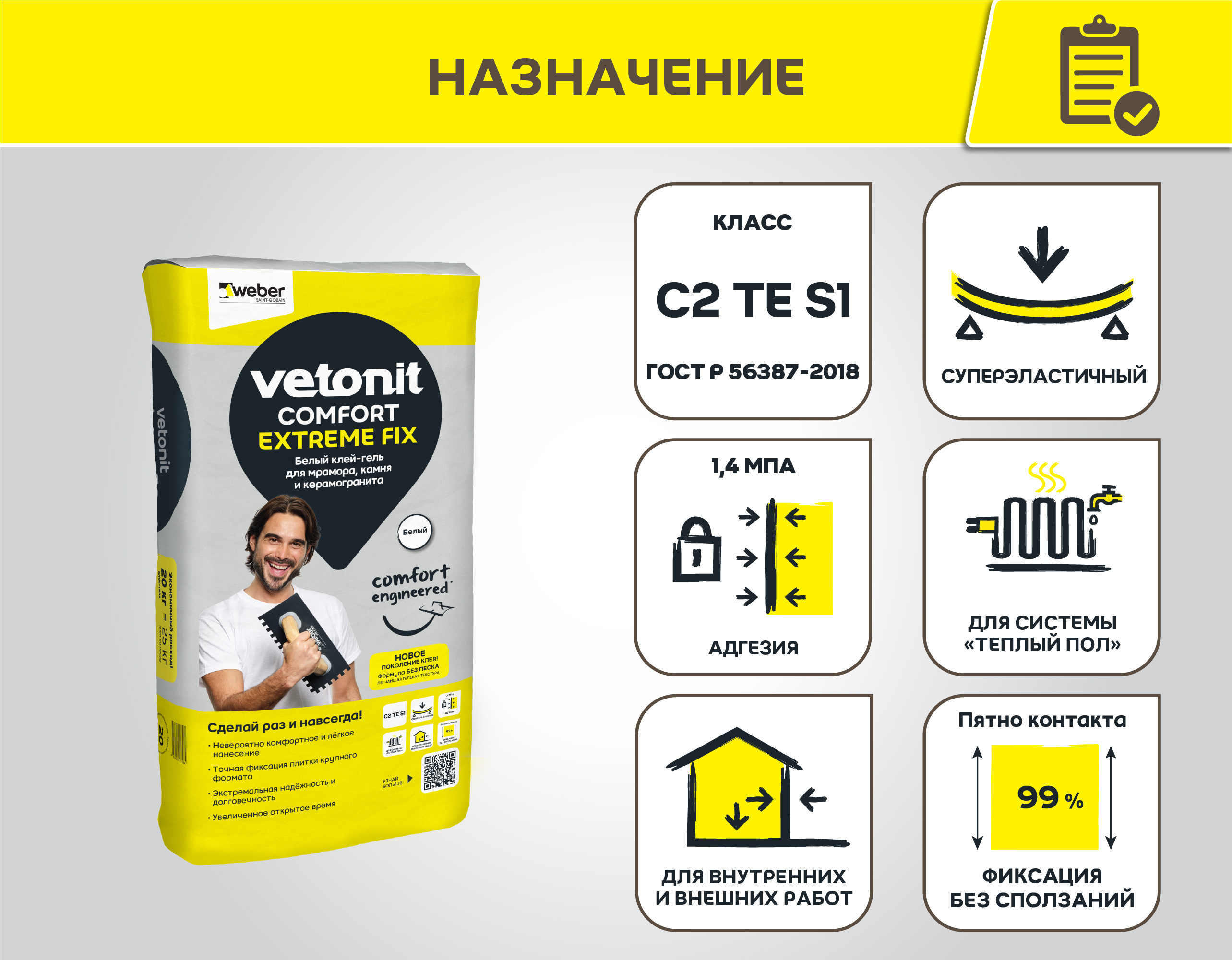 Подходит для укладки стандартного и тонкогокерамогранита, клинкерной и керамической плитки,искусственного и натурального камня, мраморнойплитки и мраморных плит на стены и полы внутри (в т.ч.в помещениях с высокой влажностью и мокрыми зонами)и снаружи зданий (входная группа, открытые балконы,лоджии, террасы, пожарные переходы, парапеты, фаса ды,цоколи)