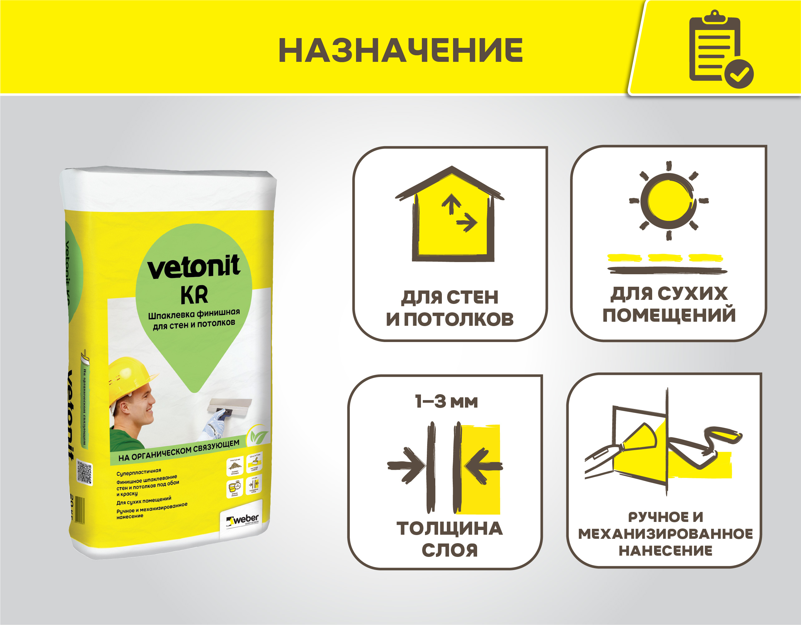 Предназначена для финишного выравнивания стен и потолков в сухих помещениях перед оклейкой обоями и покраской.