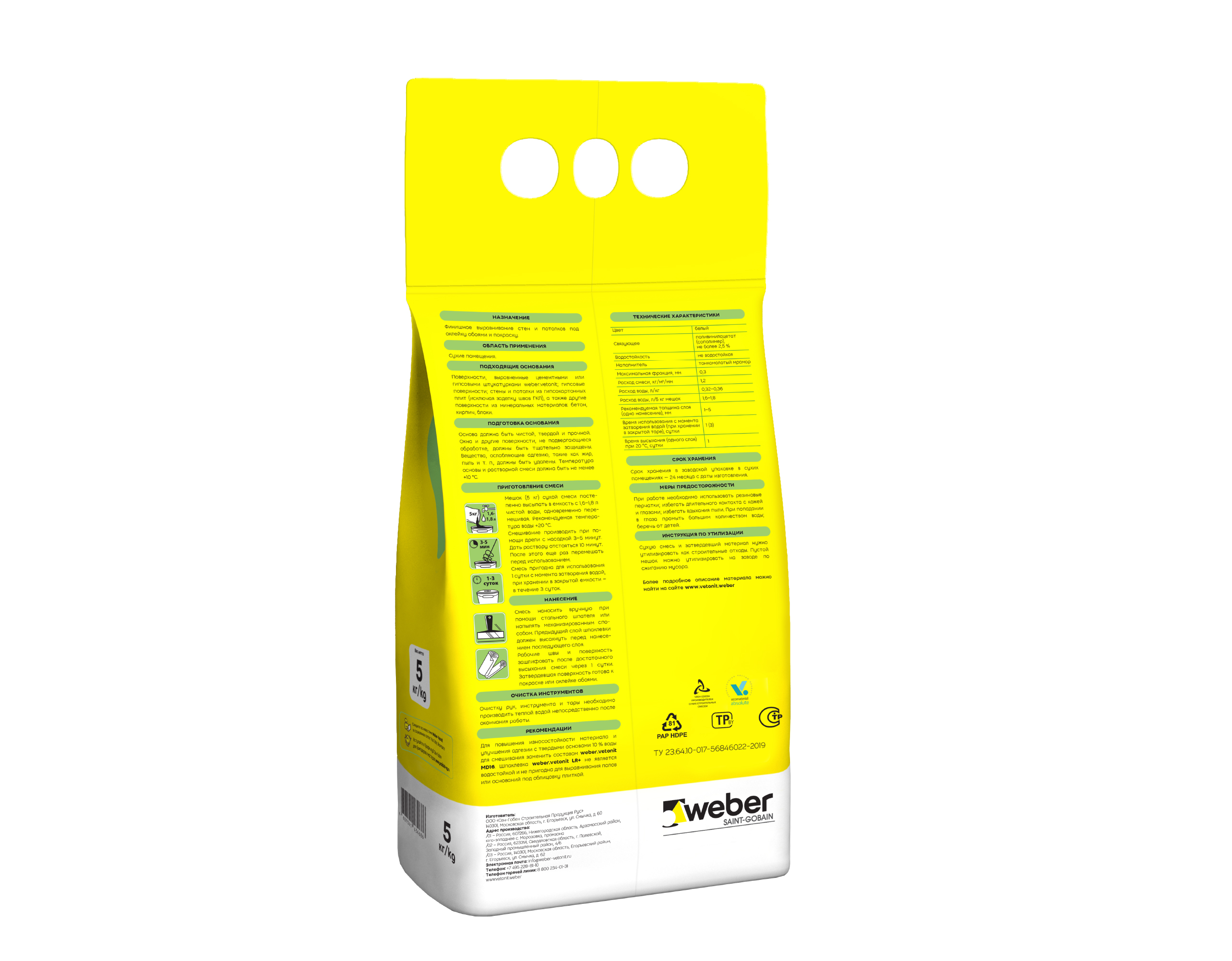 Расход воды, л/мешок1.6-1.8 (мешок 5 кг); 6.4-7.2 (мешок 20 кг)
