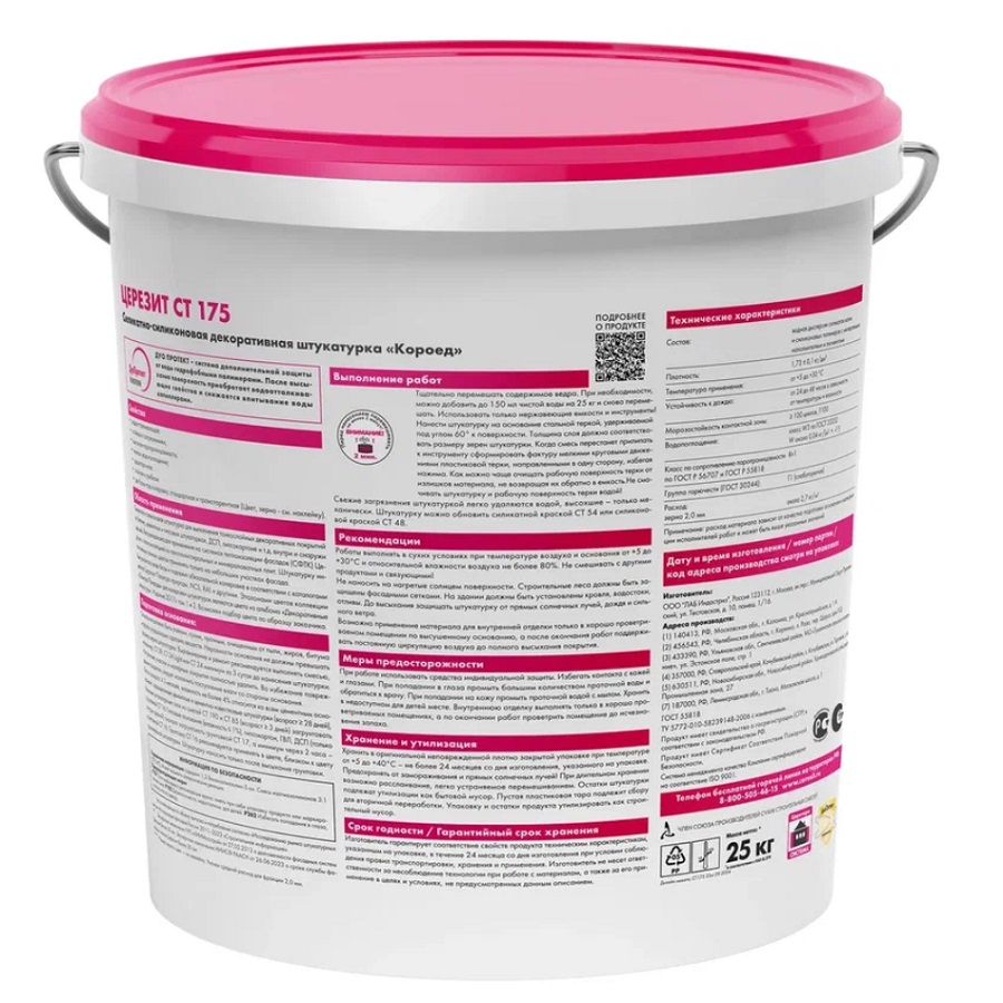 Упаковка: Декоративные штукатурки CT 174 и CT 175 поставляются в пластиковых ведрах по 25 кг.