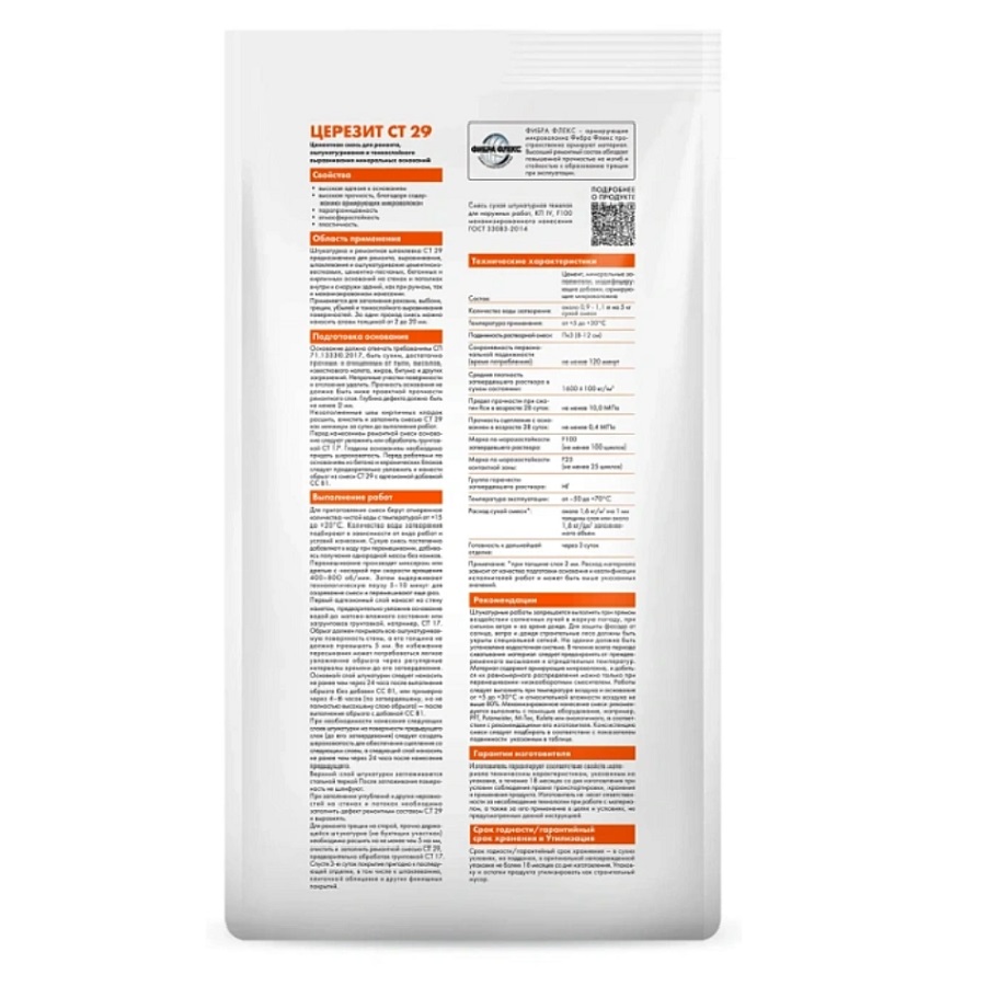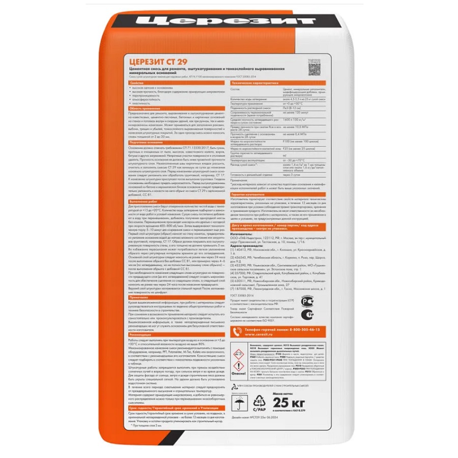 Упаковка: Сухая смесь CT 29 поставляется в многослойных бумажных мешках по 25 кг, а также в фольгированных мешках по 5 кг