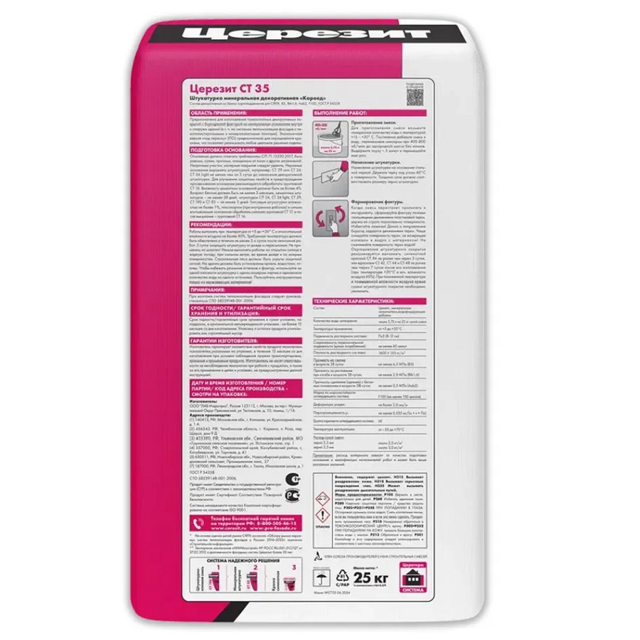 Минеральная декоративная штукатурка Церезит CT 35 «короед» зерно 2,5 мм «белая» и 2,5 / 3,5 мм «под окраску»