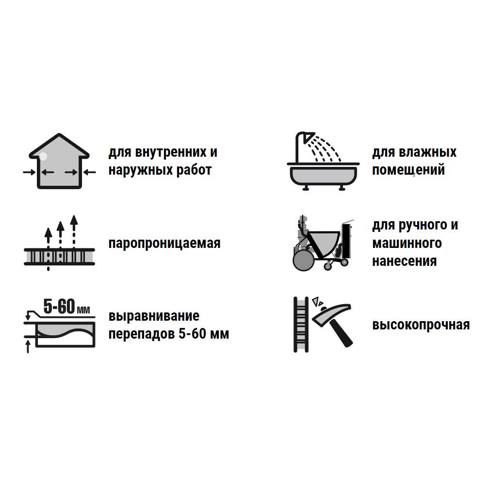 Применяется для выравнивания стен: сплошного (от 5 до 40 мм) и частичного (до 60 мм), выравнивания потолков (до 20 мм) внутри помещений с умеренной и повышенной влажностью под последующую отделку (оклейку обоями, окрашивание, облицовку плиткой и пр.).