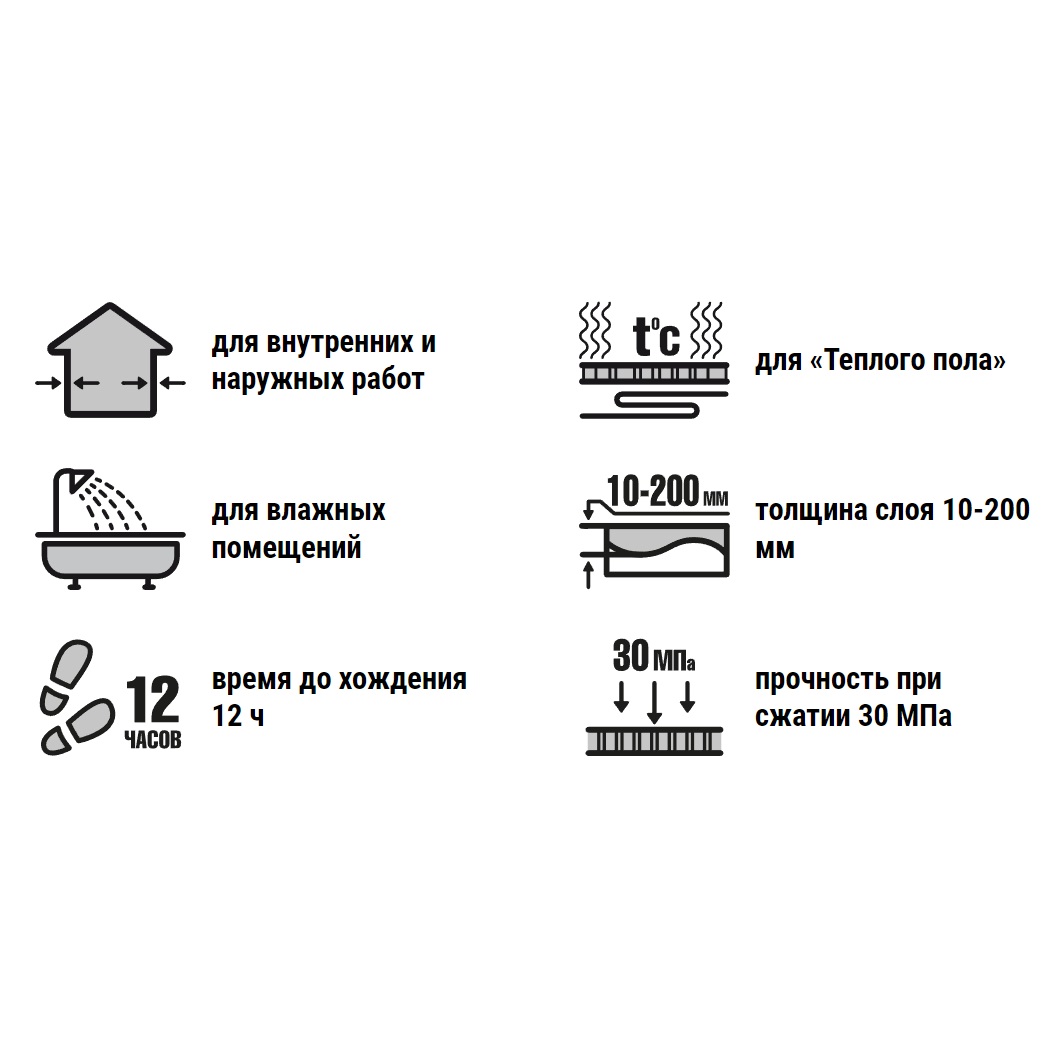 Рекомендуется использовать для внутренних и наружных работ (лестницы с облицовкой плиткой, крытые веранды, балконы, отмостка), в сухих и влажных, промерзающих и отапливаемых помещениях и при создании «полусухих» стяжек под последующую отделку