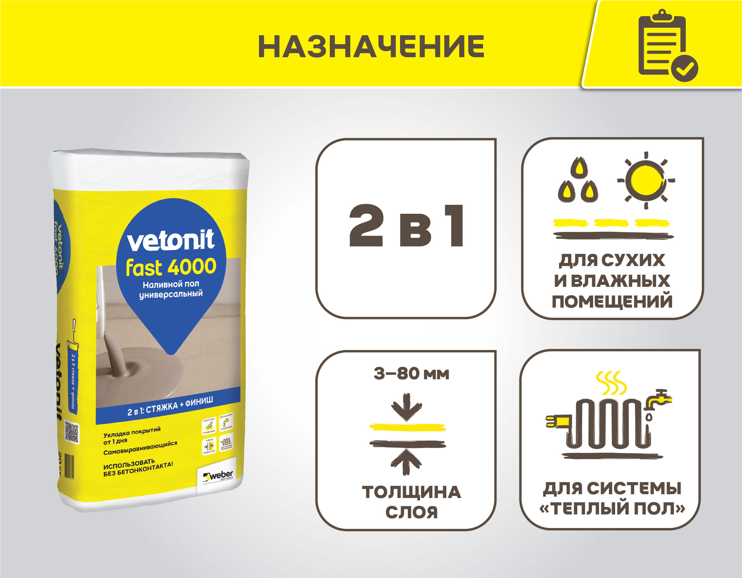 Vetonit Fast 4000 самовыравнивающийся универсальный быстротвердеющий наливной пол. 3 в 1: стяжка, финиш + ремонт благодаря широкому диапазону толщин (3-80 мм)