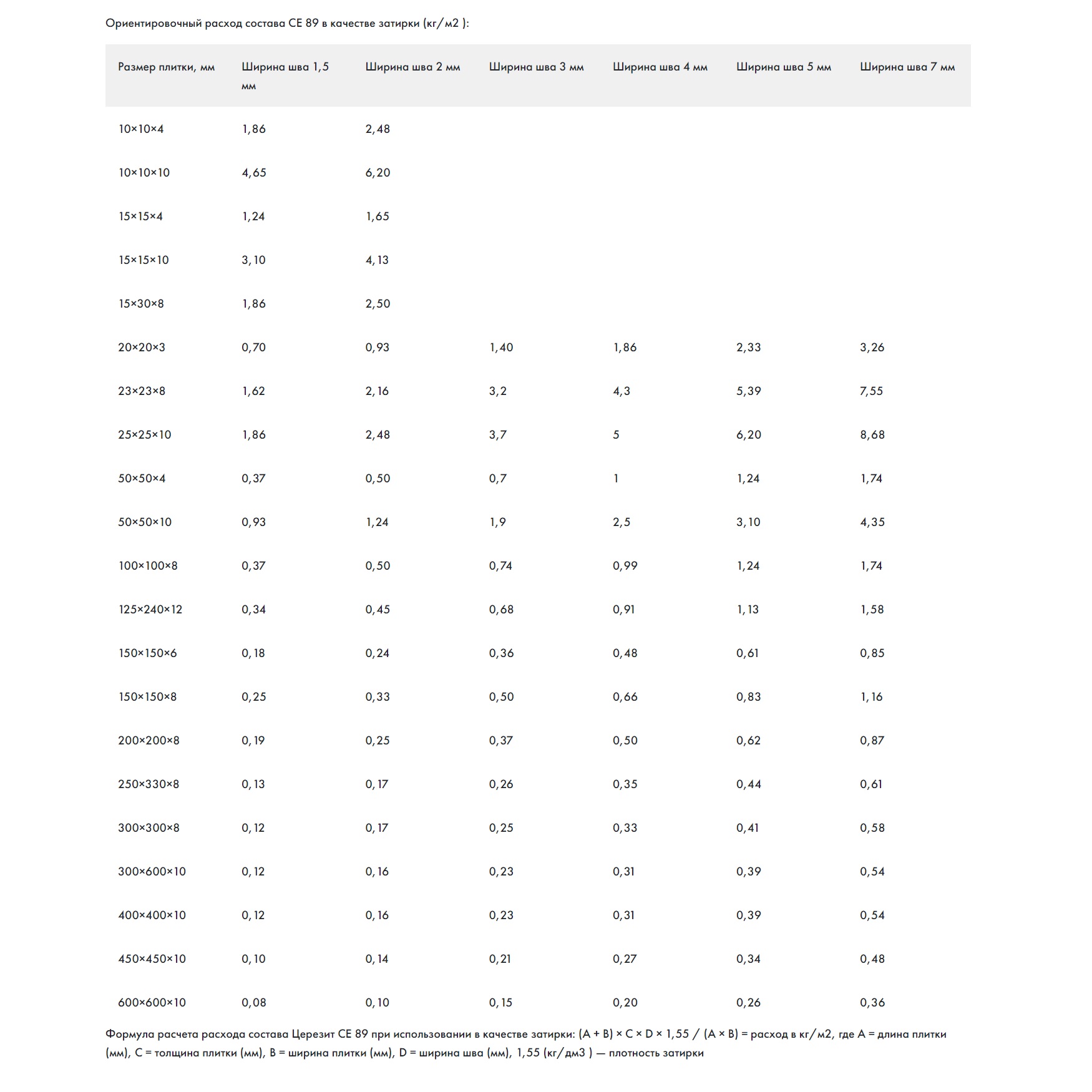 Ориентировочный расход состава СЕ 89 в качестве клея при нанесении зубчатыми шпателями с размером зубцов 4×4 мм: около 1,8 кг/м2