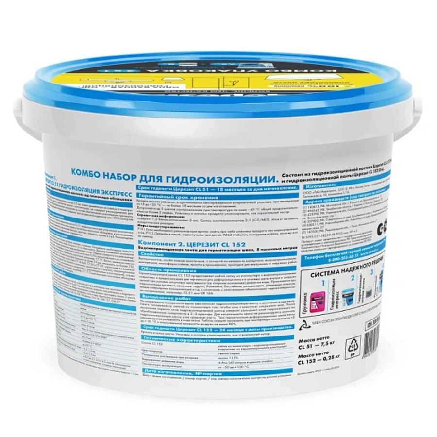 Упаковка: Гидроизоляционная масса CL 51 поставляется в пластиковых ведрах по 1,4 кг, 5 кг и 15 кг, а также в комбинированной упаковке (пластиковых ведрах) вместе с водонепроницаемой лентой CL 152, содержащей 8 кг мастики CL 51 и 8 м ленты CL 152.