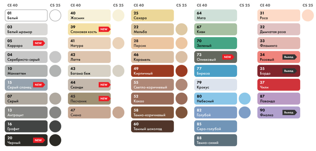 Состав CE40: цемент,минеральные заполнители, модифицирующие добавки, пигменты, гидрофобизаторы,добавки против плесени и грибка